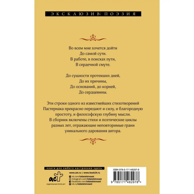 Во всем мне хочется дойти До самой сути. В работе, в поисках пути, В сердечной смуте. До сущности протекших дней, До их причины, До оснований, до корней, До сердцевины. Эти строки одного из известнейших стихотворений Пастернака прекрасно передают и силу, и благородную простоту, и философскую глубину мысли. В сборник включены стихи и поэтические циклы разных лет, отражающие неповторимые грани уникального дарования автора.
