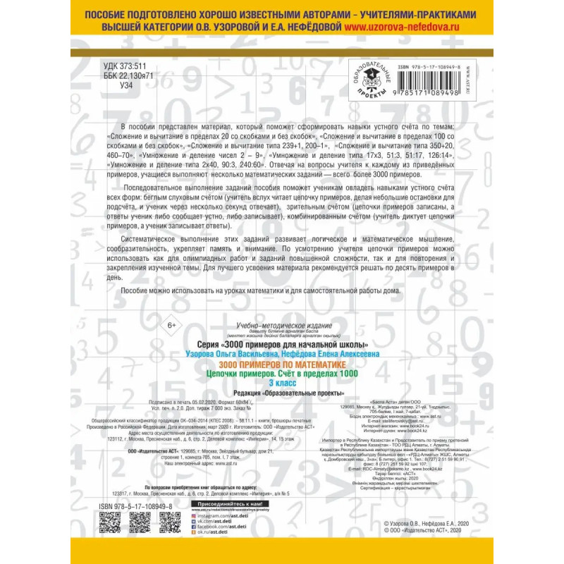 В книге известных педагогов-практиков, авторов самых издаваемых учебников и учебных пособий в России О.В. Узоровой и Е.А. Нефёдовой представлен материал, который поможет сформировать навыки устного счета по базовым темам 3 класса. Последовательное выполнение заданий пособия поможет ученикам овладеть навыками устного счёта всех форм, развить логическое и математическое мышление, сообразительность, укрепить память и внимание. Пособие можно использовать на уроках математики и для самостоятельной работы дома.
