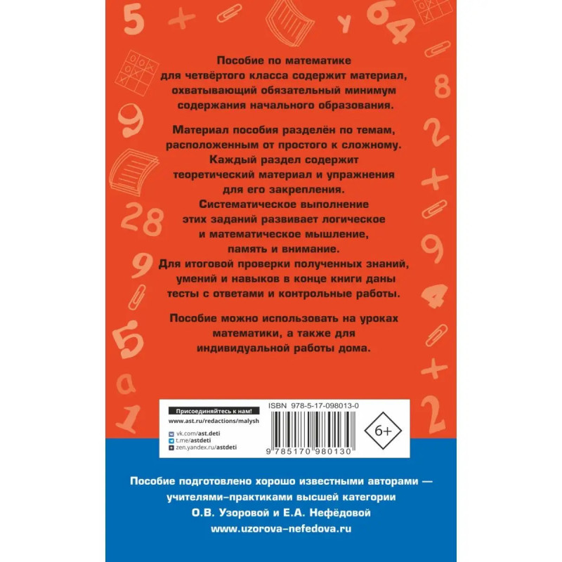 Полный курс математики для четвёртого класса содержит все необходимые правила, все типы заданий, которые четвероклассник обязательно должен знать, чтобы потом использовать выученную теорию на практике.С помощью разнообразных упражнений, а также контрольных и тестовых заданий ученики лучше осваивают изучаемую тему, тренируют память, развивают логическое мышление.Пособие можно использовать на уроках математики, а также для индивидуальной работы дома.
