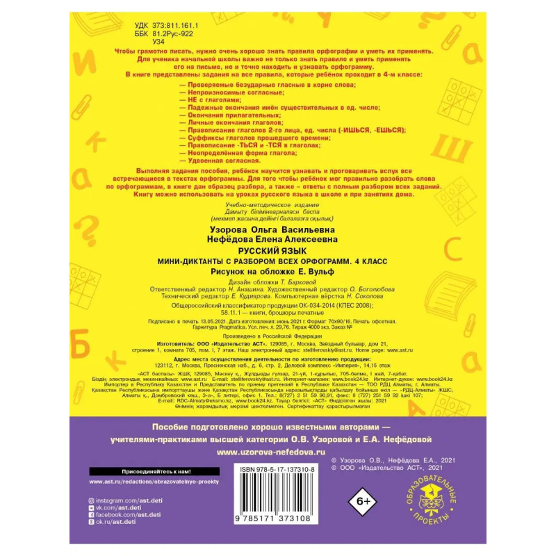Чтобы грамотно писать, нужно очень хорошо знать правила орфографии и уметь их применять. Для ученика начальной школы важно не только знать правило и уметь применять его на письме, но и точно находить и узнавать орфограмму.В книге представлены задания на все правила, которые ребёнок проходит в 4-м классе: Непроизносимые согласные; НЕ с глаголами; Падежные окончания имён существительных в ед. числе; Окончания прилагательных; Личные окончания глаголов; Правописание глаголов 2-го лица, ед. числа (-ИШЬСЯ, -ЕШЬСЯ); Суффиксы глаголов прошедшего времени; Правописание -ТЬСЯ и -ТСЯ в глаголах; Неопределённая форма глагола.Выполняя задания пособия, ребёнок научится узнавать и проговаривать вслух все встречающиеся в текстах орфограммы. Для того чтобы ребёнок мог правильно разобрать слова по орфограммам, в книге дан образец разбора, а также ответы с полным разбором всех заданий.Книгу можно использовать на уроках русского языка в школе и при занятиях дома.