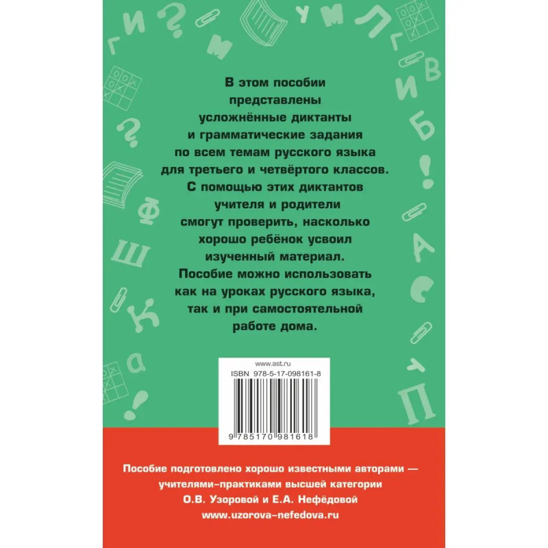 В пособии известных педагогов-практиков, авторов самых издаваемых учебников и учебных пособий в России О.В. Узоровой и Е.А. Нефёдовой представлены усложненные диктанты и грамматические задания по всем темам русского языка для 3 и 4 классов. Диктант один из основных видов обучения грамотному письму для закрепления навыков и проверки знаний учащихся. С помощью этого пособия учителя и родители смогут проверить, насколько хорошо ребенок усвоил изучаемый материал.