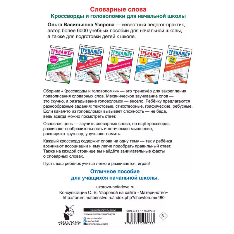 Словарные слова. Кроссворды и головоломки для начальной школы это сборник кроссвордов по русскому для учеников 14-го классов, основанный на авторской методике О. В. Узоровой. Книга поможет ученикам выучить словарные слова, обогатить словарный запас, вызвать познавательный интерес к русскому языку.
