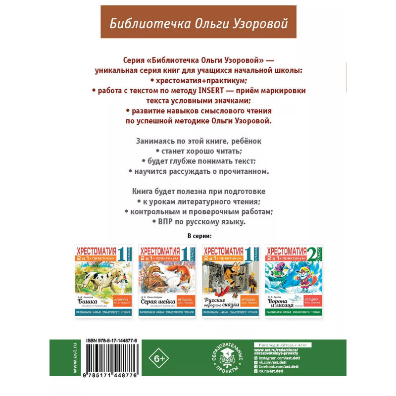 Пособие из серии Библиотечка Ольги Узоровой сочетает в себе хрестоматию и практикум. Для эффективного обучения ребёнка работе с текстом в пособии предлагается метод (INSERT) приём маркировки текста условными значками. Кроме текста художественных произведений в книге дано полное методическое сопровождение, где детально объясняется как ребёнок должен работать с текстом. Работа с пособием разовьёт у учащихся начальной школы навыки смыслового чтения и грамотной работы с текстом художественного произведения. Эти навыки пригодятся им на уроках литературы, на контрольных работах, на ВПР по русскому языку в 4 классе, на государственной итоговой аттестации в старших классах.
