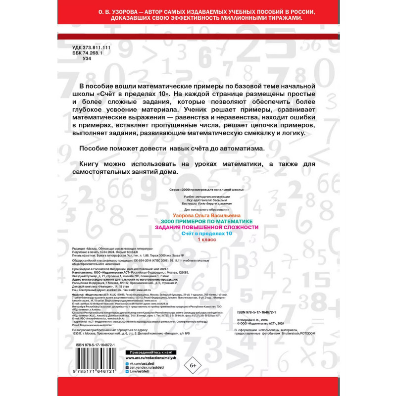 В пособие вошли математические примеры по базовой теме начальной школы Счёт в пределах 10. Задания повышенной сложности помогут более глубоко усвоить материал и довести навык счёта до автоматизма.Ученик решает примеры, сравнивает математические выражения равенства и неравенства, находит ошибки в примерах, вставляет пропущенные числа, решает цепочки примеров, выполняет задания, развивающие математическую смекалку и логику.