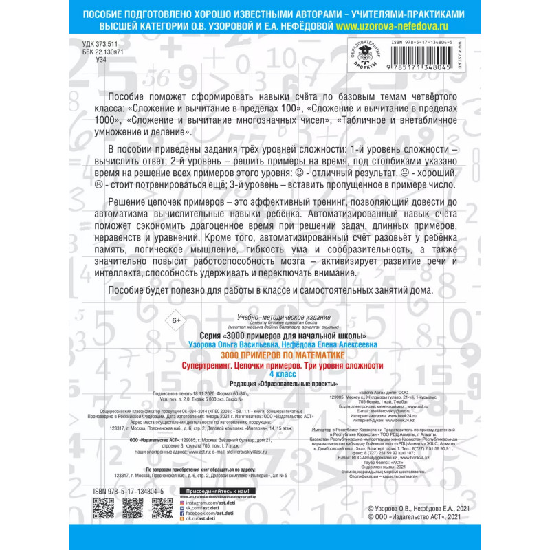 Пособие поможет сформировать навыки счёта по базовым темам четвёртого класса: Сложение и вычитание в пределах 100, Сложение и вычитание в пределах 1000, Сложение и вычитание многозначных чисел, Табличное и внетабличное умножение и деление. В пособии приведены задания трёх уровней сложности. Решение цепочек примеров это эффективный тренинг, позволяющий довести до автоматизма вычислительные навыки ребёнка. Автоматизированный навык счёта поможет сэкономить драгоценное время при решении задач, длинных примеров, неравенств и уравнений. Кроме того, автоматизированный счёт разовьёт у ребёнка память, логическое мышление, гибкость ума и сообразительность, а также значительно повысит работоспособность мозга активизирует развитие речи и интеллекта, способность удерживать и переключать внимание. Пособие будет полезно для работы в классе и самостоятельных занятий дома.