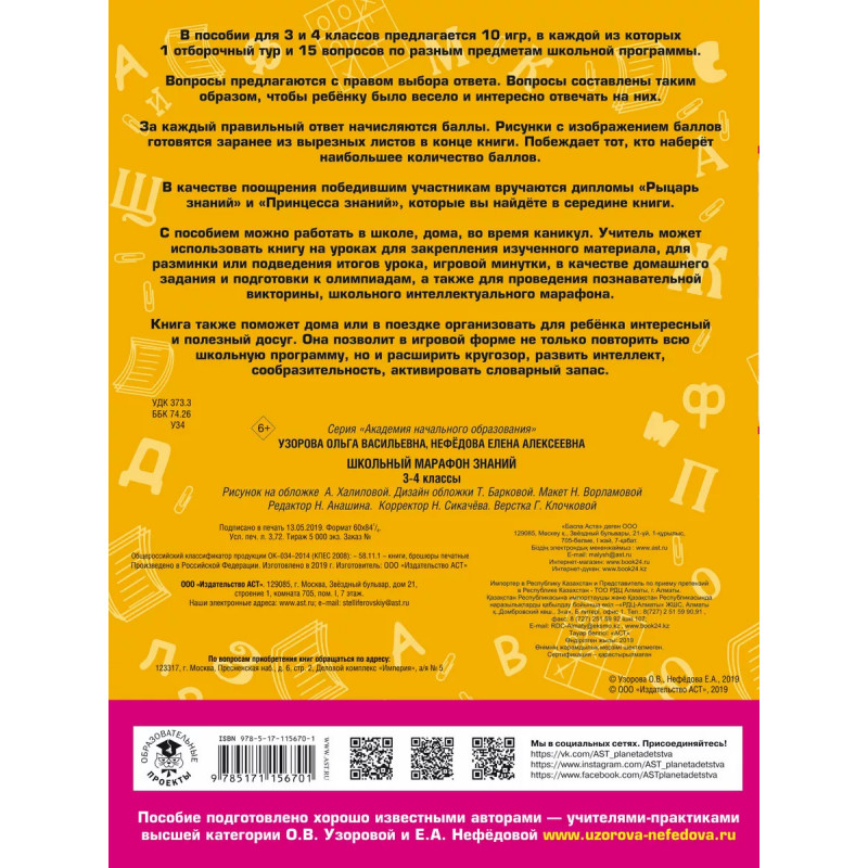 В пособии для 3 и 4 классов предлагается 10 игр, в каждой из которых 1 отборочный тур и 15 вопросов по разным предметам школьной программы. Вопросы предлагаются с правом выбора ответа. Вопросы составлены таким образом, чтобы ребёнку было весело и интересно отвечать на них. За каждый правильный ответ начисляются баллы. Рисунки с изображением баллов готовятся заранее из вырезных листов в конце книги. Побеждает тот, кто наберёт наибольшее количество баллов. В качестве поощрения победившим участникам вручаются дипломы Рыцарь знаний и Принцесса знаний, которые вы найдёте в середине книги. С пособием можно работать в школе, дома, во время каникул. Учитель может использовать книгу на уроках для закрепления изученного материала, для разминки или подведения итогов урока, игровой минутки, в качестве домашнего задания и подготовки к олимпиадам, а также для проведения познавательной викторины, школьного интеллектуального марафона.