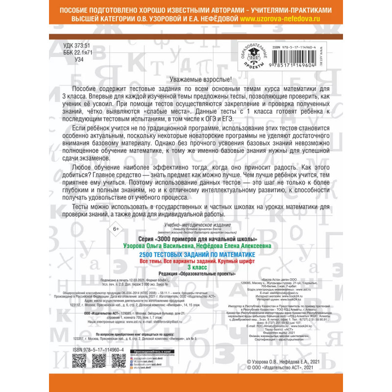 Пособие содержит тестовые задания по всем основным темам курса математики для 3 класса. Впервые для каждой изученной темы предложены тесты, позволяющие проверить, как ученик её усвоил. При помощи тестов осуществляются закрепление и проверка полученных знаний, чётко выявляются "слабые места". Данные тесты с первого класса готовят ребёнка к последующим тестовым испытаниям, в том числе к ОГЭ и ЕГЭ. Если ребёнок учится не по традиционной программе, использование этих тестов становится особенно актуальным, поскольку некоторые новаторские программы не уделяют достаточного внимания базовому материалу. Однако без прочного усвоения базовых знаний невозможно полноценное обучение математике, к тому же именно базовые знания нужны для успешной сдачи экзаменов. Любое обучение наиболее эффективно тогда, когда оно приносит радость. Как этого добиться? Главное средство знать предмет как можно лучше. Чем лучше ребёнок учится, тем приятнее ему учиться.