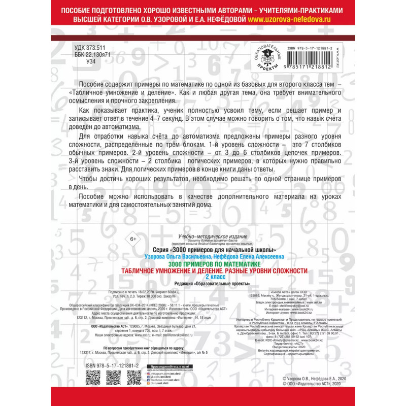 Пособие содержит примеры по математике по одной из базовых для второго класса тем Табличное умножение и деление. Как и любая другая тема, она требует внимательного осмысления и прочного закрепления. Для отработки навыка счёта до автоматизма предложены примеры разного уровня сложности, распределенные по трём блокам. 1-й уровень сложности это 7 столбиков обычных примеров. 2-й уровень сложности от 3 до 6 столбиков цепочек примеров. 3-й уровень сложности 2 столбика логических примеров, в которых нужно правильно расставить знаки. Для логических примеров в конце книги даны ответы. Пособие можно использовать в качестве дополнительного материала на уроках математики и для самостоятельных занятий дома.