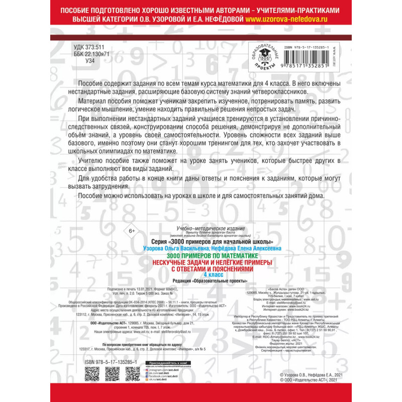 Пособие содержит задания по всем темам курса математики для 4 класса. В него включены нестандартные задания, расширяющие базовую систему знаний четвероклассников. Материал пособия поможет ученикам закрепить изученное, потренировать память, развить логическое мышление, умение находить правильные решения непростых задач. При выполнении нестандартных заданий учащиеся тренируются в установлении причинно-следственных связей, конструировании способа решения, демонстрируя не дополнительный объём знаний, а уровень своей самостоятельности. Уровень сложности всех заданий выше базового, именно поэтому они станут хорошим тренингом для тех, кто захочет участвовать в школьных олимпиадах по математике. Учителю пособие также поможет на уроке занять учеников, которые быстрее других в классе выполняют все виды заданий. Для удобства работы в конце книги даны ответы и пояснения к заданиям, которые могут вызвать затруднения. Пособие можно использовать на уроках в школе и для самостоятельных занятий дома.