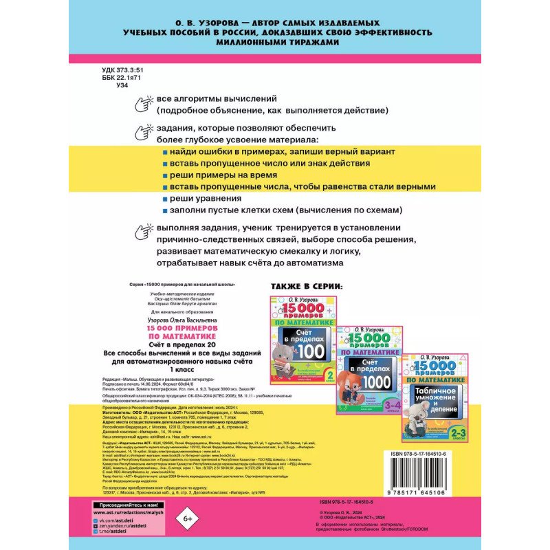 Характеристики 15 000 примеров по математике. Счет в пределах 20. 1 класс.
