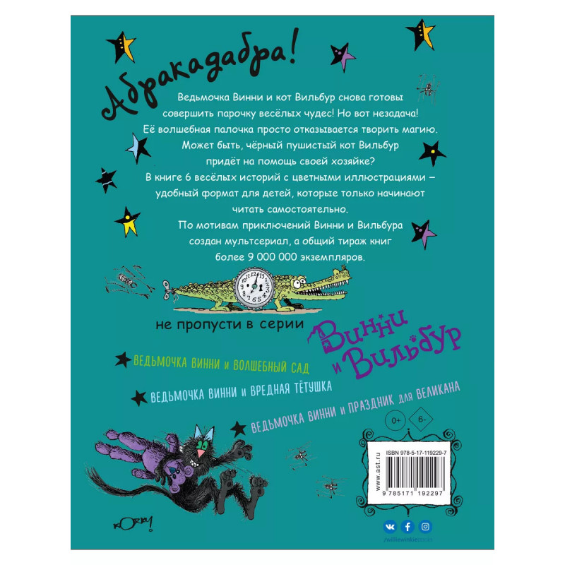 Ведьмочка Винни и её новый кот. Большой пушистый чёрный кот Вильбур больше не хочет играть со своей хозяйкой. Ведь нет ничего лучше, чем лежать на солнышке и сладко спать. Вот только ведьмочке Винни ужасно скучно. И тогда она решает завести нового кота... В каждой книге 6 весёлых историй с цветными иллюстрациями. Истории состоят из маленьких глав - удобный формат для детей, которые только начинают читать самостоятельно. По мотивам приключений Винни и Вильбура создан мультсериал, а общий тираж книг более 9 000 000 экз.Благодаря запоминающимся, невероятно смешным и обаятельным иллюстрациям Корки Пола истории о Винни и Вильбуре удостоены почётной награды The Children's Book Award.