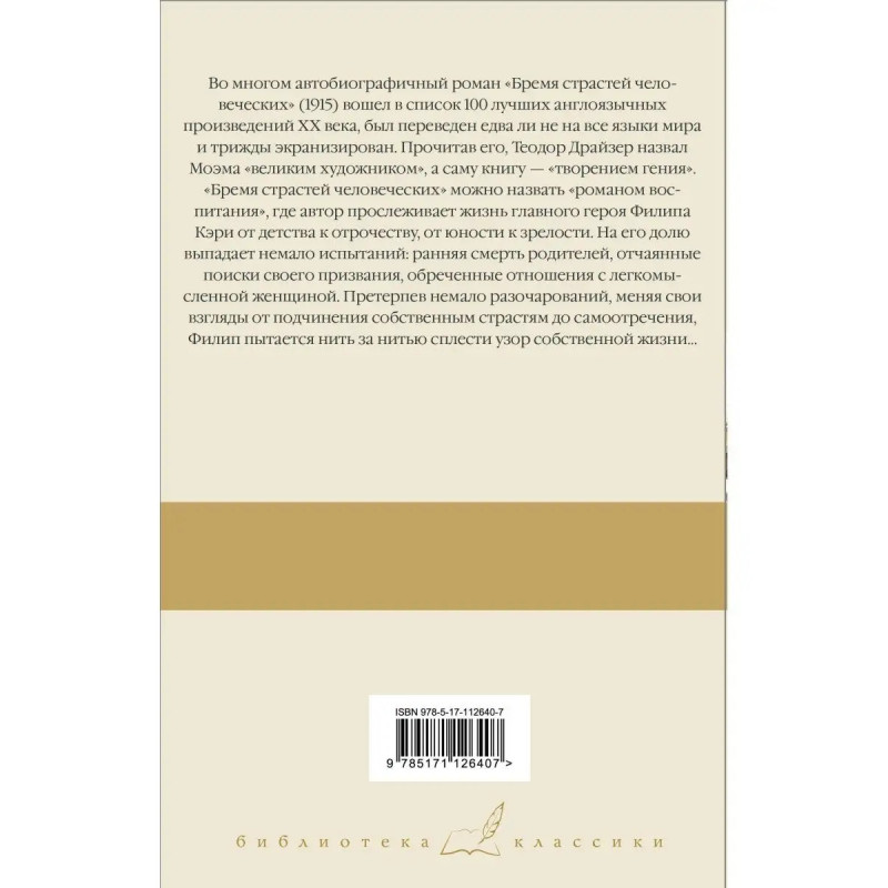 Во многом автобиографичный роман "Бремя страстей человеческих" (1915) вошел в список 1 лучших англоязычных произведений XX века, был переведен едва ли не на все языки мира и трижды экранизирован. Прочитав его, Теодор Драйзер назвал Моэма "великим художником", а саму книгу "творением гения". "Бремя страстей человеческих" можно назвать "романом воспитания", где автор прослеживает жизнь главного героя Филипа Кэри от детства к отрочеству, от юности к зрелости. На его долю выпадает немало испытаний: ранняя смерть родителей, отчаянные поиски своего призвания, обреченные отношения с легкомысленной женщиной. Претерпев немало разочарований, меняя свои взгляды от подчинения собственным страстям до самоотречения, Филип пытается нить за нитью сплести узор собственной жизни