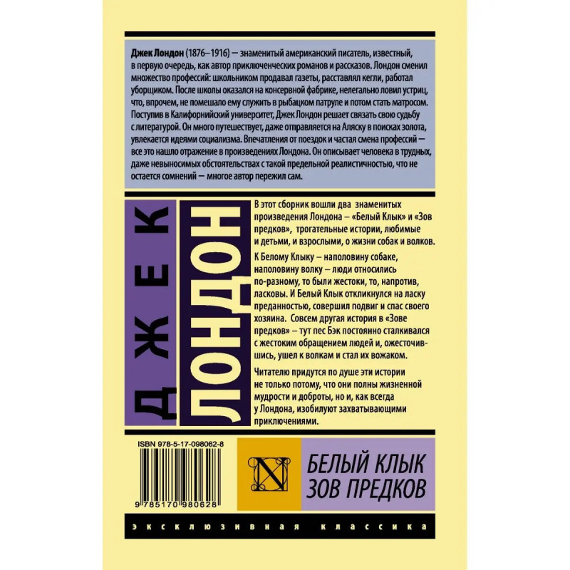 В сборник вошли два знаменитых произведения Лондона "Белый Клык" и "Зов предков", трогательные истории, любимые и детьми, и взрослыми, о жизни собак и волков. К Белому Клыку наполовину собаке, наполовину волку люди относились по-разному, то были жестоки, то, напротив, ласковы. И Белый Клык откликнулся на ласку преданностью, совершил подвиг и спас своего хозяина. Совсем другая история в "Зове предков" тут пес Бэк постоянно сталкивался с жестоким обращением людей и, ожесточившись, ушел к волкам и стал их вожаком. Читателю придутся по душе эти истории не только потому, что они полны жизненной мудрости и доброты, но и, как всегда у Лондона, изобилуют захватывающими приключениями.