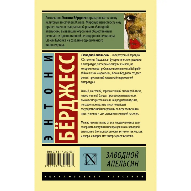 "Заводной апельсин" литературный парадокс ХХ столетия. Продол-жая футуристические традиции в литературе, экспериментируя с языком, на котором говорит рубежное поколение malltshipalltshikov и kisok "надсатых", Энтони Бёрджесс создает роман, признанный классикой современной литературы. Умный, жестокий, харизматичный антигерой Алекс, лидер уличной банды, проповедуя насилие как высокое искусство жизни, как род наслаждения, попадает в железные тиски новейшей государственной программы по перевоспитанию преступников и сам становится жертвой наси-лия. Можно ли спасти мир от зла, лишая человека воли совершать пос-тупки и превращая его в "заводной апельсин"? Этот вопрос сегодня актуален так же, как и вчера, и вопрос этот автор задает читателю.