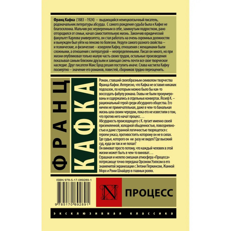 Роман, ставший своеобразным символом творчества Франца Кафки. Интересно, что Кафка не оставил никаких подсказок, по которым можно было бы как-то воссоздать фабулу романа. Главы не были пронумерованы и содержались в отдельных конвертах. Йозеф К. рациональный герой среди абсурдного общества. Его ничем не примечательная, даже в чем-то банальная жизнь шла своим чередом, пока его не известили о том, что против него начат процесс... Абсурдность происходящего с К. пугает именно своей приземленной, холодной обыденностью, повседневностью и даже странной логичностью творящегося с героем ужаса, противостоять которому он не в силах. Где судья, которого он ни разу не видел? Где высокий суд, куда он так и не попал? Он виноват просто потому, что каждый человек в этой жизни может быть в чем-то виноват... Страшная и нелепо смешная атмосфера "Процесса" потрясающе точно передана Орсоном Уэллсом в его знаменитой экранизации с Энтони Перкинсом, Жанной Моро и Роми Шнайдер в главных ролях.