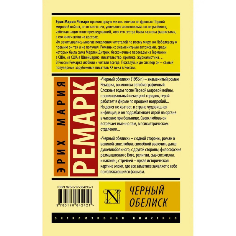 "Черный обелиск" (1956 г.) знаменитый роман Ремарка, во многом автобиографичный. Сложные годы после Первой мировой войны, провинциальный немецкий городок, герой работает в фирме по продаже надгробий Но денег не хватает, в стране чудовищная инфляция, и он подрабатывает игрой на органе в часовне при больнице. Свою любовь он встречает именно там, в психиатрическом отделении "Черный обелиск" - с одной стороны, роман о великой силе любви, способной вылечить даже душевнобольного, с другой стороны философские размышления о Боге, религии, смысле жизни, и наконец, с третьей яркая историческая картина эпохи, где все заметнее заявляет о себе приближающийся фашизм.