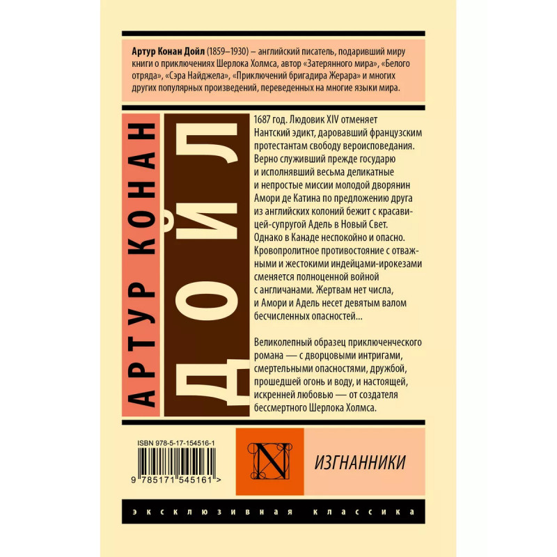 Изгнанники. 1687 год. Людовик XIV отменяет Нантский эдикт, даровавший французским протестантам свободу вероисповедания. Верно служивший прежде государю и исполнявший весьма деликатные и непростые миссии молодой дворянин Амори де К.атина по предложению друга из английских колоний бежит с красавицей-супругой Адель в Новый Свет. Однако в Канаде неспокойно и опасно. Кровопролитное противостояние с отважными и жестокими индейцами-ирокезами сменяется полноценной войной с англичанами. Жертвам нет числа, и Амори и Адель несет девятым валом бесчисленных опасностей... Великолепный образец приключенческого романа - с дворцовыми интригами, смертельными опасностями, дружбой, прошедшей огонь и воду, и настоящей, искренней любовью - от создателя бессмертного Шерлока Холмса.