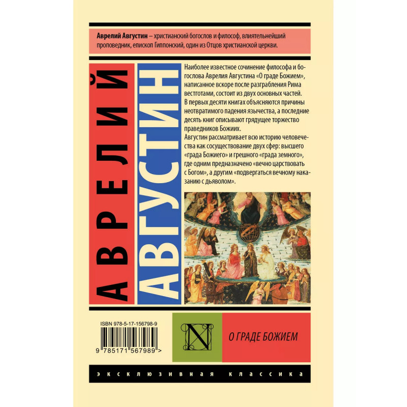 О граде Божием. Аврелий Августин - христианский богослов и философ, влиятельнейший проповедник, епископ Гиппонский, один из Отцов христианской церкви. Наиболее известное сочинение философа и богослова Аврелия Августина "О граде Божием", написанное вскоре после разграбления Рима вестготами, состоит из двух основных частей. В первых десяти книгах объясняются причины неотвратимого падения язычества, а последние десять книг описывают грядущее торжество праведников Божиих. Августин рассматривает всю историю человечества как сосуществование двух сфер: высшего "града Божиего" и грешного "града земного", где одним предназначено "вечно царствовать с Богом", а другим "подвергаться вечному наказанию с дьяволом".