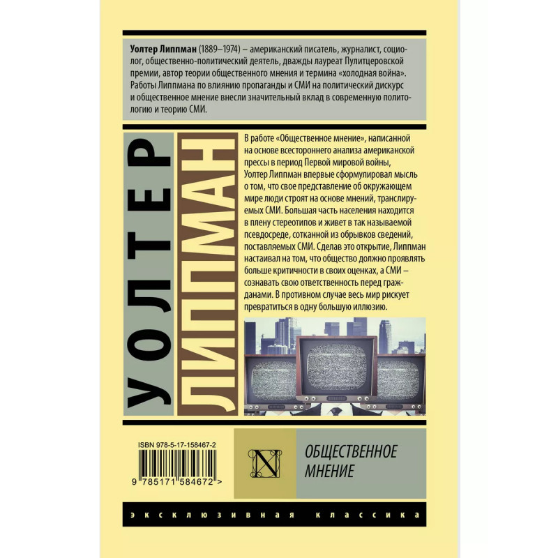 Общественное мнение. Уолтер Липпман (1889-1974) - американский писатель, журналист, пропагандист и социолог, один из творцов современного американского либерализма, двукратный лауреат Пулитцеровской премии. Принимал активное участие в предвыборной кампании американского президента Вудро Вильсона и в разработке "Четырнадцати пунктов" - американской программы послевоенного развития мира. Во время Первой мировой войны занимался вопросами пропаганды и написал бессчетное количество листовок и статей, однако позже был отстранен Вильсоном от работы из-за идеологических разногласий. Идея Липпмана о том, что пропаганда должна служить не столько делу победы, сколько закладыванию основ справедливого послевоенного мира, была объявлена неприемлемой. В своей работе "Общественное мнение" автор объединил философский, психологический, исторический, социологический и политологический анализ и ввел понятия псевдосреды и стереотипа, которые, на его взгляд, ставят под сомнение принципиальную возможность развития демократии. Свои выкладки автор подкре