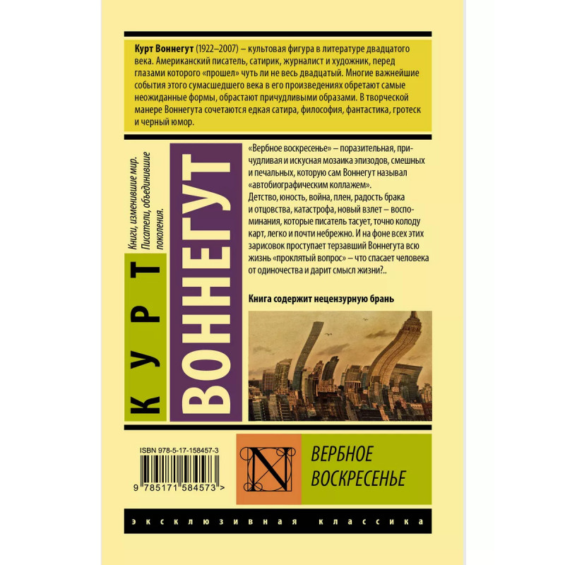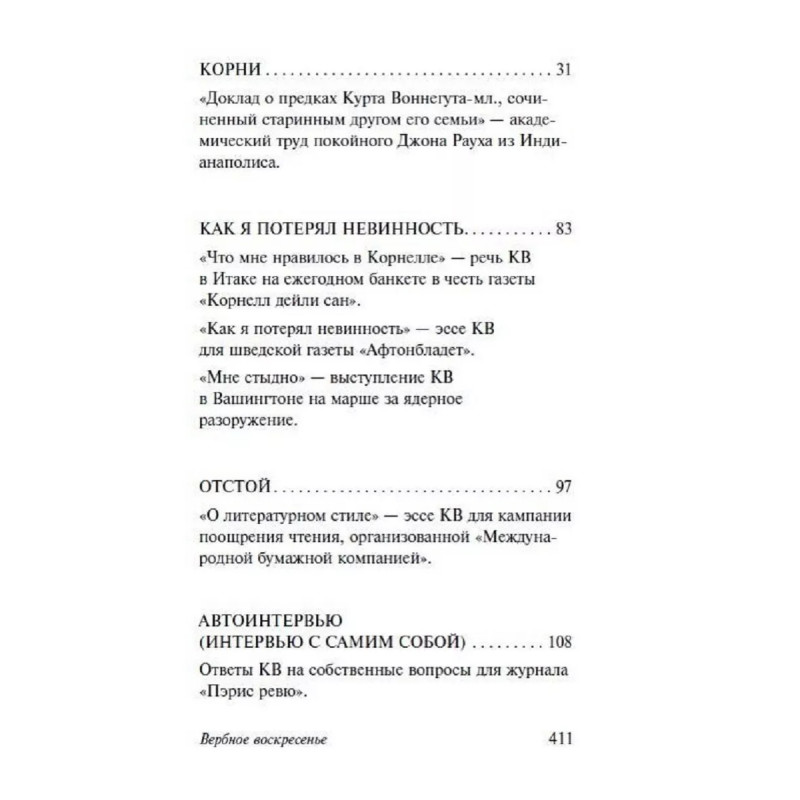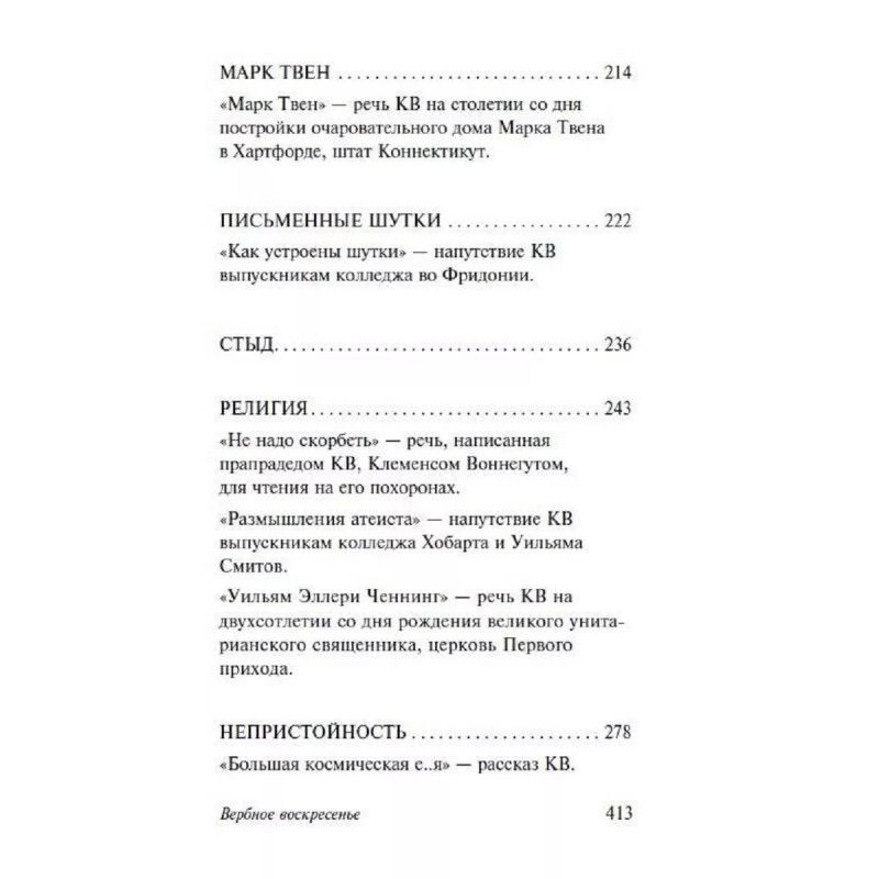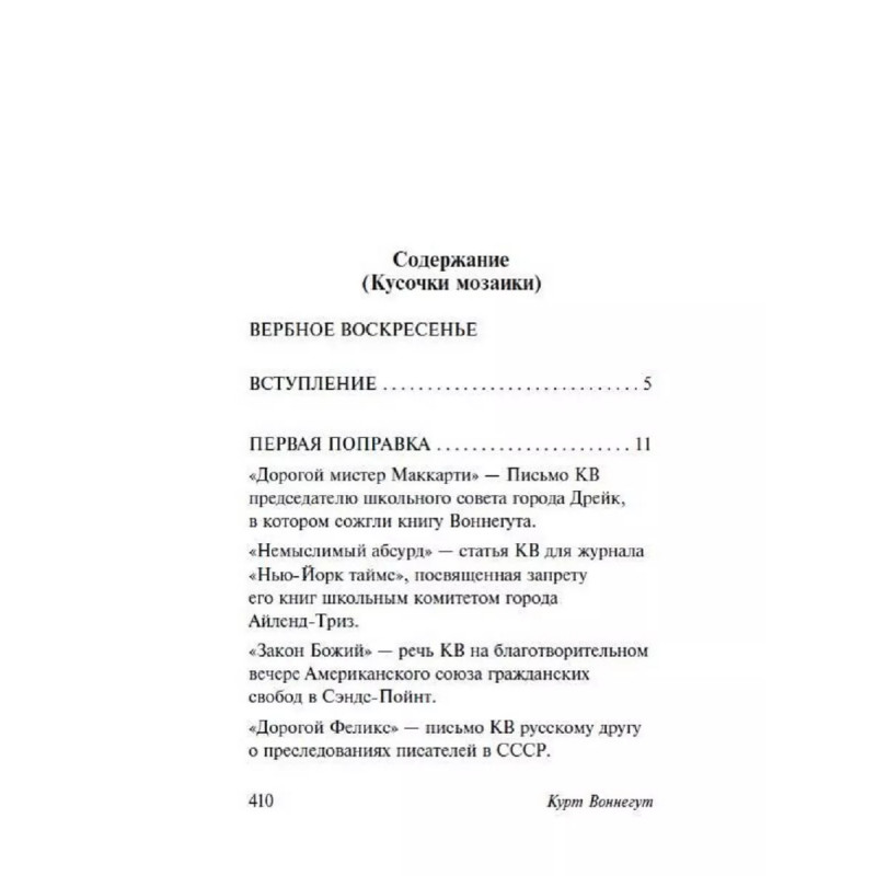 Вербное воскресенье. От автора романов "Бойня номер пять", "Сирены Титана" и "Колыбель для кошки". Сам Воннегут называл "Вербное воскресенье" "автобиографическим коллажем". Этот сборник - удивительное полотно из писем, отрывков разговоров и историй знаменитого американского писателя. Если вы поклонник черного юмора и острой сатиры - эта книга для вас!