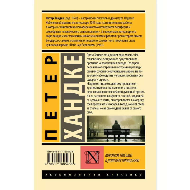 Короткое письмо к долгому прощанию. Прозу Хандке объединяет одна мысль: бессмысленное, бездуховное существование противно человеческой природе. Его герои переживают острейший внутренний разлад с самими собой и с окружающим миром, не позволяют себе ощутить "блаженство жизни без судорог и страха". "Короткое письмо к долгому прощанию" - хроника путешествия молодого писателя, переживающего тяжелейший духовный кризис. Из-за затяжного конфликта с женой, задавшейся целью его убить, он отправляется в Америку, где переезжает из города в город, меняет отель за отелем, но на самом деле бежит от самого себя.