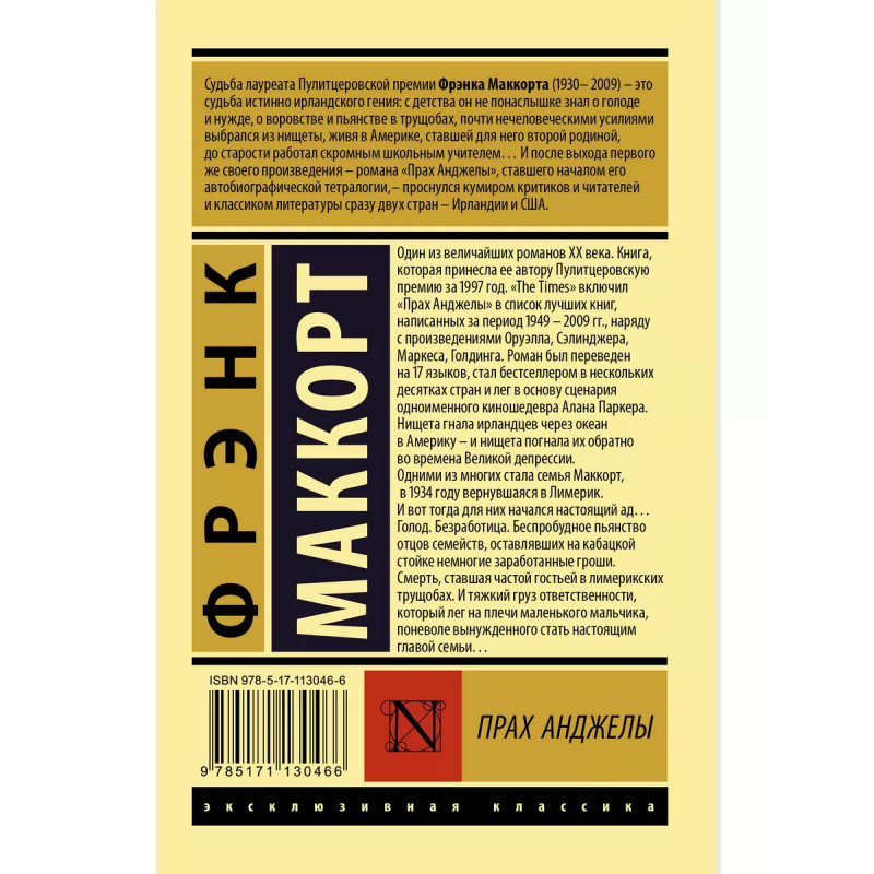 Прах Анджелы. Один из величайших романов ХХ века. Книга, которая принесла ее автору Пулитцеровскую премию за 1997 год. "The Times" включил "Прах Анджелы" в список лучших книг, написанных за период 1949-2009 гг., наряду произведениями Оруэлла, Сэлинджера, Маркеса, Голдинга. Роман был переведен на 17 языков, стал бестселлером в нескольких десятках стран и лег в основу сценария одноименного киношедевра Алана Паркера. Нищета гнала ирландцев через океан в Америку, - и нищета погнала их обратно во времена Великой депрессии. Одними из многих стала семья Маккорт, в 1934 году вернувшаяся в Лимерик. И вот тогда для них начался настоящий ад Голод. Безработица. Беспробудное пьянство отцов семейств, оставлявших на кабацкой стойке немногие заработанные гроши. Смерть, ставшая частой гостьей в лимерикских трущобах. И тяжкий груз ответственности, который лег на плечи маленького мальчика, вынужденного стать настоящим главой семьи