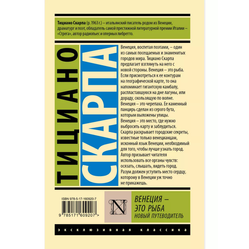Венеция - это рыба. Венеция, воспетая поэтами, - один из самых посещаемых и знаменитых городов мира. Тициано Скарпа предлагает взглянуть на него с новой стороны. Венеция - это рыба. Если присмотреться к ее контурам на географической карте, то она напоминает гигантскую камбалу, распластавшуюся на дне лагуны, или дораду, скользящую по волне. Венеция - это черепаха. Ее каменный панцирь сделан из серого бута, которым выложены улицы. Венеция - это место, где нужно выбросить карту и заблудиться. Скарпа раскрывает городские секреты, известные только венецианцам, исконный язык Венеции, необходимый для того, чтобы лучше узнать город. Автор призывает читателя, использовать все органы чувств: осязать, слышать, видеть, чувствовать город, разум должен уступить место чувствам, а именно сердцу, которому в Венеции уж точно не прикажешь.