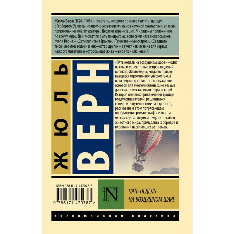 "Пять недель на воздушном шаре" - одно из самых увлекательных произведений великого Жюля Верна, когда-то пользовавшееся огромной популярностью, а в последние десятилетия послужившее основой для многочисленных, но весьма далеких от текста романа экранизаций. История опасных приключений троицы воздухоплавателей, решившихся совершить путешествие на аэростате, рассказана в этом потрясающем воображение романе на фоне экзотических картин Африки - удивительного животного мира, причудливых обрядов и верований населяющих ее племен.