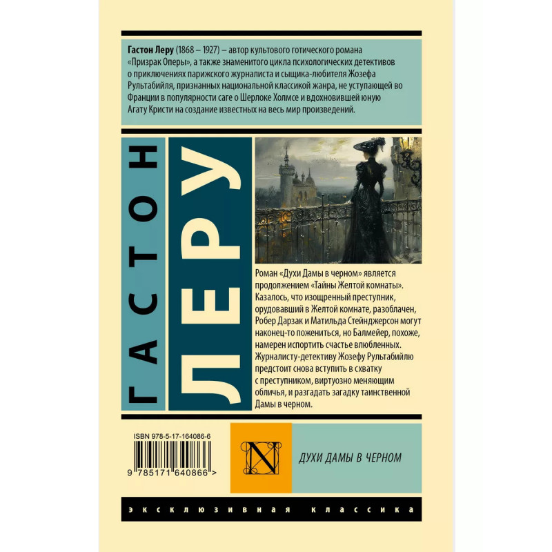 Роман "Духи Дамы в черном" является продолжением "Тайны Желтой комнаты". Казалось, что изощренный преступник, орудовавший в Желтой комнате, разоблачен, Робер Дарзак и Матильда Стейнджерсон могут наконец-то пожениться, но Балмейер похоже намерен испортить счастье влюбленных. Журналисту-детективу Жозефу Рультабийлю предстоит снова вступить в схватку с преступником, виртуозно меняющим обличия, и разгадать загадку таинственной Дамы в черном.