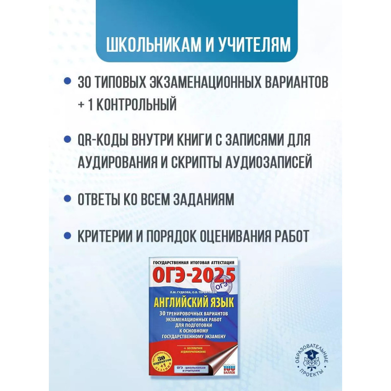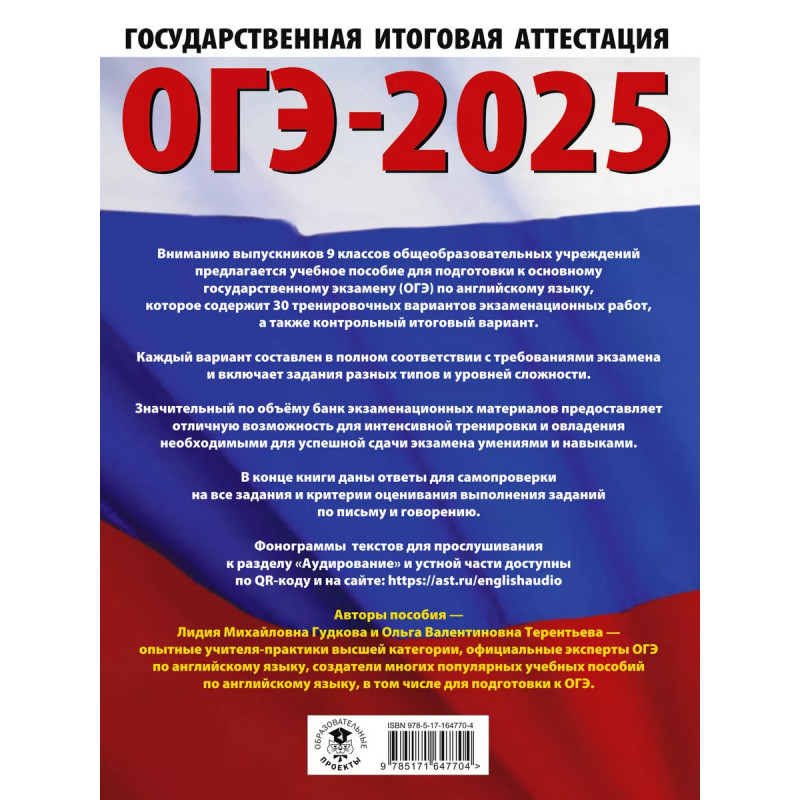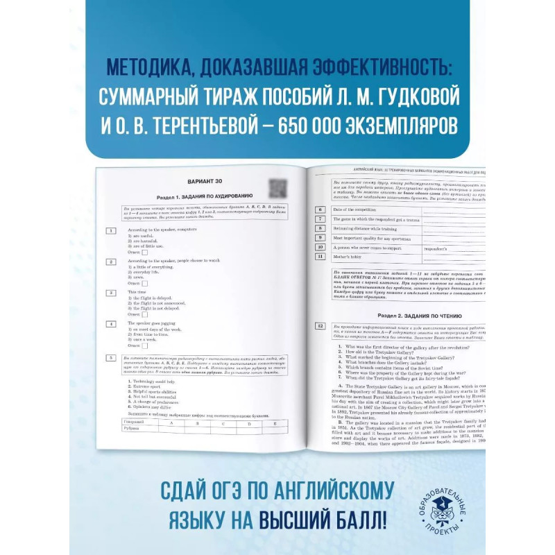 Вниманию выпускников 9-х классов общеобразовательных учреждений предлагается учебное пособие для подготовки к основному государственному экзамену (ОГЭ) по английскому языку, которое содержит 30 тренировочных вариантов экзаменационных работ, а также контрольный итоговый вариант.Каждый вариант составлен в полном соответствии с требованиями экзамена и включает задания разных типов и уровней сложности. Значительный по объёму банк экзаменационных материалов предоставляет отличную возможность для интенсивной тренировки и овладения необходимыми для успешной сдачи экзамена умениями и навыками.В конце книги даны ответы для самопроверки на все задания и критерии оценивания выполнения заданий по письму и говорению. Авторы пособия Лидия Михайловна Гудкова и Ольга Валентиновна Терентьева опытные учителя-практики высшей категории, официальные эксперты ОГЭ по английскому языку, создатели многих популярных учебных пособий по английскому языку, в том числе для подготовки к ОГЭ.