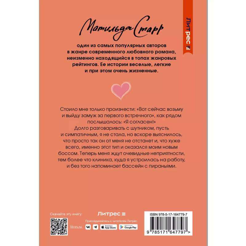 Стоило мне только произнести: "Вот сейчас возьму и выйду замуж за первого встречного", как рядом послышалось: "Я согласен!" Долго разговаривать с шутником, пусть и симпатичным, я не стала, но вскоре выяснилось, что просто так он от меня не отстанет и, что хуже всего, именно этот тип и оказался моим новым боссом. Теперь меня ждут очевидные неприятности, тем более что клиника, куда я устроилась на работу, и без того напоминает бассейн с пираньями.