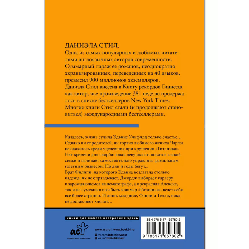 Для всех поклонников творчества Джо Беверли, Джулии Куин и Лизы Клейпас. Даниэла Стил одна из самых популярных писательниц в мире, совокупный тираж ее книг превышает 800 000 000 экземпляров. Юной Эдвине Уинфилд удалось пережить крушение Титаника, но ее родители и горячо любимый жених сгинули в пучине Атлантики. Двадцатилетней девушке приходится взвалить на свои плечи воспитание младших братьев и сестер и управление семейным бизнесом. На собственную личную жизнь времени не остается