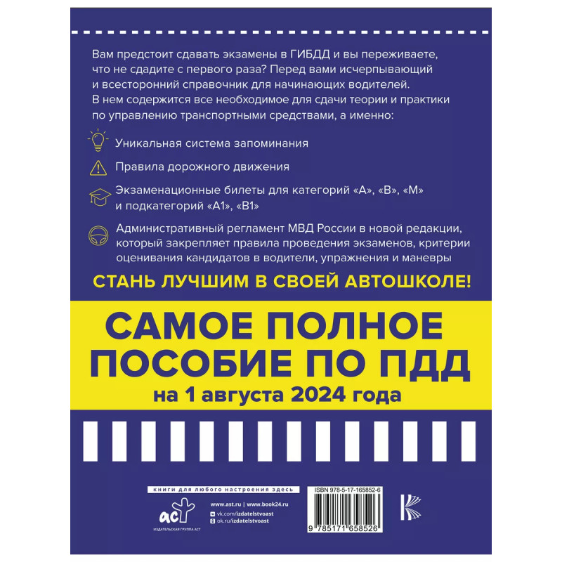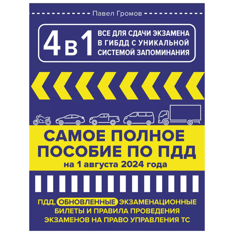 Вам предстоит сдавать экзамены в ГИБДД и вы переживаете, что не сдадите с первого раза? Перед вами исчерпывающий и всесторонний справочник для начинающих водителей. В нем содержится все необходимое для сдачи теории и практики по управлению транспортными средствами, а именно: уникальная система запоминания, которая поможет Вам быстро и успешно подготовиться к экзаменам в ГИБДД; правила дорожного движения на 1 августа 2024 года с иллюстрациями; экзаменационные билеты для категорий "A", "B", "M" и подкатегорий "А1", "B1"; административный регламент МВД России в новой редакции, который закрепляет правила проведения экзаменов, критерии оценивания кандидатов в водители, упражнения, маневры и многое другое. Дополнительно в пособии приводятся: правила оказания первой помощи пострадавшим на дороге; алгоритм действий водителя при ДТП; таблица штрафов и других санкций за нарушение ПДД. Издание учитывает все изменения, опубликованные в официальных источниках на момент подписания издания в печать.