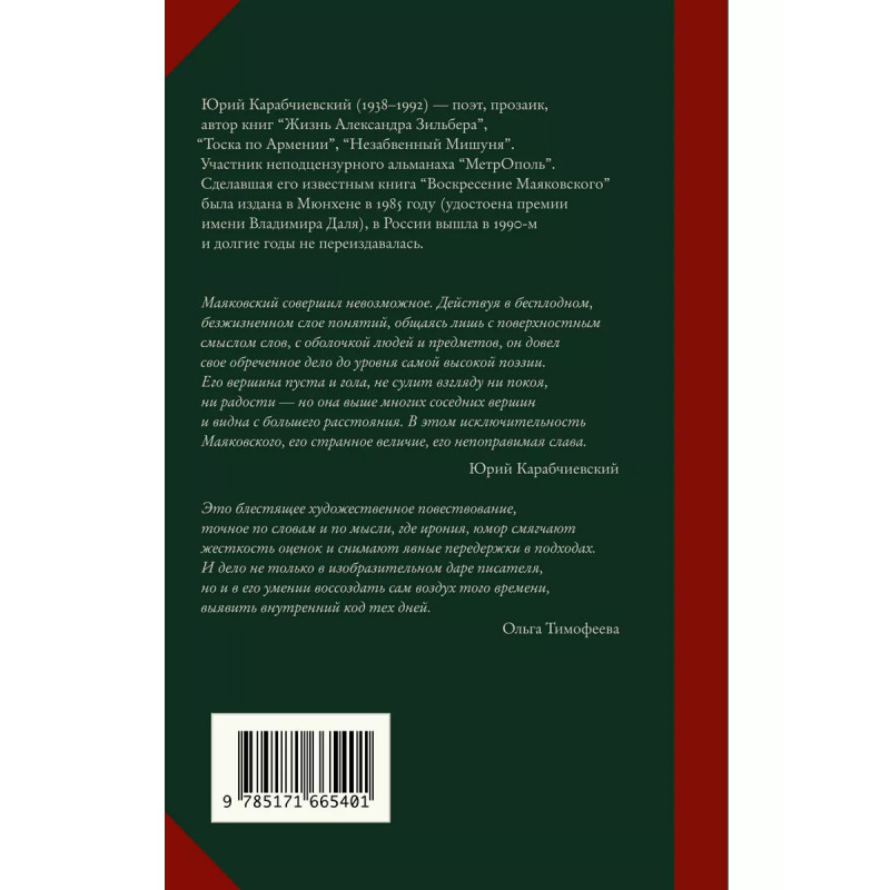 Юрий Карабчиевский (19381992) поэт, прозаик, автор книг Жизнь Александра Зильбера, Тоска по Армении, Незабвенный Мишуня. Участник неподцензурного альманаха МетроОполь. Сделавшая его известным книга Воскресение Маяковского была издана в Мюнхене в 1985 году (удостоена премии имени Владимира Даля), в России вышла в 1990-м и долгие годы не переиздавалась. "Маяковский совершил невозможное. Действуя в бесплодном, безжизненном слое понятий, общаясь лишь с поверхностным смыслом слов, с оболочкой людей и предметов, он довел свое обреченное дело до уровня самой высокой поэзии. Его вершина пуста и гола, не сулит взгляду ни покоя, ни радости, но она выше многих соседних вершин и видна с большего расстояния. В этом исключительность Маяковского, его странное величие, его непоправимая слава". Юрий Карабчиевский