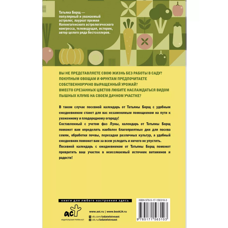 Татьяна Борщ популярный и уважаемый астролог, лауреат премии Копенгагенского астрологического конгресса, телеведущая, историк, автор целого ряда бестселлеров. Вы не представляете свою жизнь без работы в саду? Покупным овощам и фруктам предпочитаете собственноручно выращенный урожай? Вместо срезанных цветов любите наслаждаться видом пышных клумб на своем дачном участке? В таком случае посевной календарь от Татьяны Борщ с удобным ежедневником станет для вас незаменимым помощником на пути к ухоженному и плодородному огороду! Составленный с учетом фаз Луны, календарь от Татьяны Борщ поможет вам определить наиболее благоприятные дни для посева семян, обработки почвы, пересадки различных культур, а удобный ежедневник поможет вам за всем уследить и ничего не упустить. Посевной календарь с ежедневником от Татьяны Борщ поможет превратить ваш участок в неиссякаемый источник витаминов и радости!