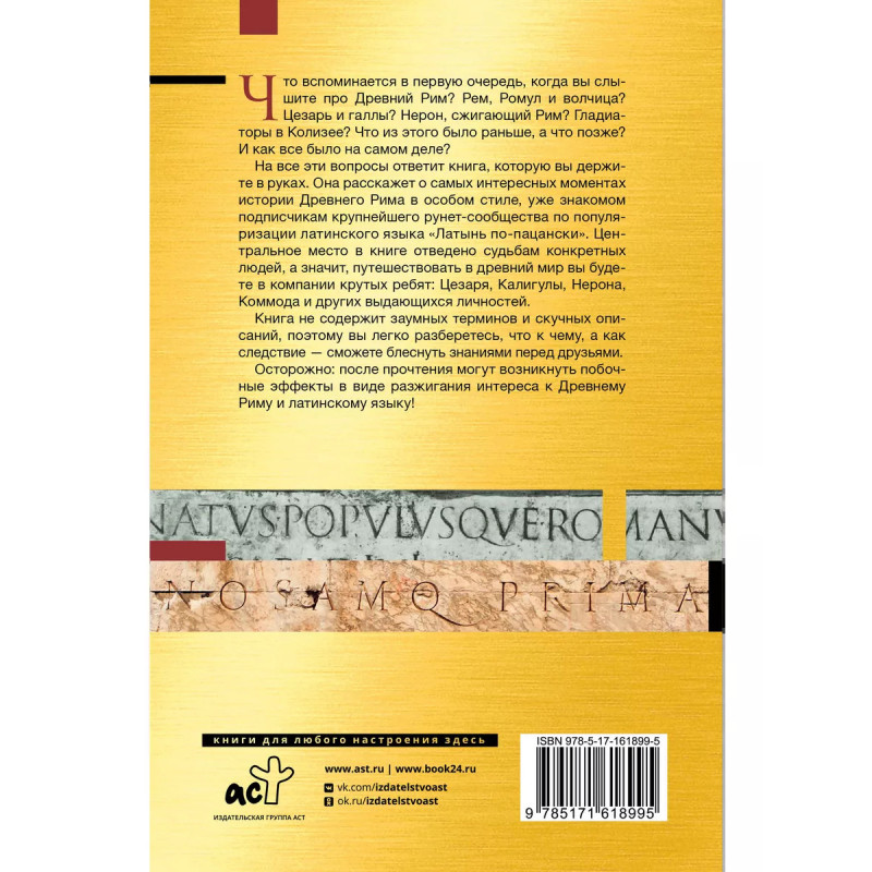 Латынь по-пацански. Как часто ты думаешь о Римской империи?. Что вспоминается в первую очередь, когда вы слышите про Древний Рим? Рем, Ромул и волчица? Цезарь и галлы? Нерон, сжигающий Рим? Гладиаторы в Колизее? Что из этого было раньше, а что позже? И как все было на самом деле? На все эти вопросы ответит книга, которую вы держите в руках. Она расскажет о самых интересных моментах истории Древнего Рима в особом стиле, уже знакомом подписчикам крупнейшего рунет-сообщества по популяризации латинского языка "Латынь по-пацански". Центральное место в книге отведено судьбам конкретных людей, а значит, путешествовать в древний мир вы будете в компании крутых ребят: Цезаря, Калигулы, Нерона, Коммода и других выдающихся личностей. Книга не содержит заумных терминов и скучных описаний, поэтому вы легко разберетесь, что к чему, а как следствие - сможете блеснуть знаниями перед друзьями. Осторожно: после прочтения могут возникнуть побочные эффекты в виде разжигания интереса к Древнему Риму и латинскому языку!