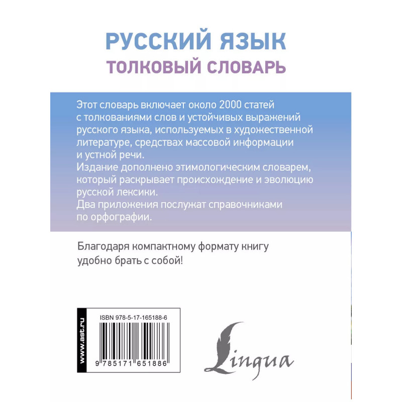 Настоящее издание включает "Толковый словарь русского языка" Ю. В. Алабугиной, который содержит около 2000 слов и устойчивых сочетаний. Издание дополнено "Этимологическим словарем русского языка" (примерно 1000 слов), а также двумя приложениями, которые могут послужить читателю как орфографические справочники. Книга адресована широкому кругу читателей: всем, кто интересуется русским языком и хочет грамотно писать и говорить по-русски.