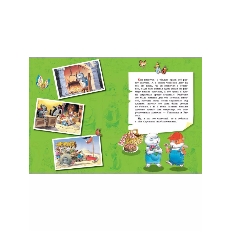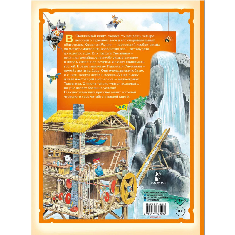 В Волшебной книге сказок ты найдёшь четыре истории о чудесном лесе и его очаровательных обитателях. Хомячок Рыжик настоящий изобретатель: он может смастерить абсолютно всё от табурета до водопровода. Его подруга Снежинка отличная хозяйка, она печёт самые вкусное в мире миндальное печенье и любит принимать гостей. Новые знакомые Рыжика и Снежинки семейство птиц Додо. Они очень дружелюбные, и с ними всегда легко и весело. А ещё в лесу живёт настоящий волшебник медвежонок Топтыжка. Он пока только учится колдовать, но уже делает большие успехи! О захватывающих приключениях жителей чудесного леса читайте в нашей книге.