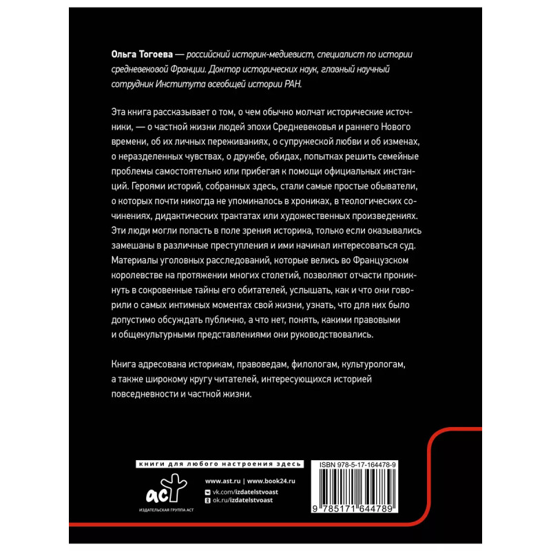 Ольга Тогоева российский историк-медиевист, специалист по истории средневековой Франции. Доктор исторических наук, главный научный сотрудник Института всеобщей истории РАН. Эта книга рассказывает о том, о чем обычно молчат исторические источники, о частной жизни людей эпохи Средневековья и раннего Нового времени, об их личных переживаниях, о супружеской любви и об изменах, о неразделенных чувствах, о дружбе, обидах, попытках решить семейные проблемы самостоятельно или прибегая к помощи официальных инстанций. Героями историй, собранных здесь, стали самые простые обыватели, о которых почти никогда не упоминалось в хрониках, в теологических сочинениях, дидактических трактатах или художественных произведениях. Эти люди могли попасть в поле зрения историка, только если оказывались замешаны в различные преступления и ими начинал интересоваться суд. Материалы уголовных расследований, которые велись во Французском королевстве на протяжении многих столетий, позволяют отчасти проникнуть в сокровенные тайны его обит