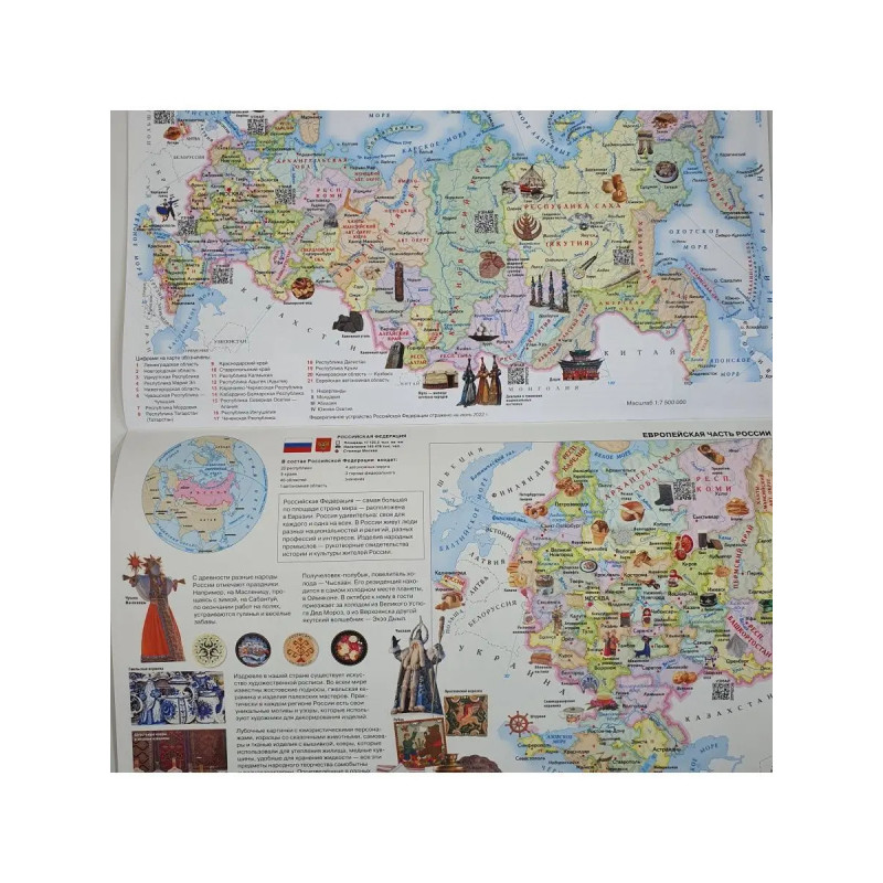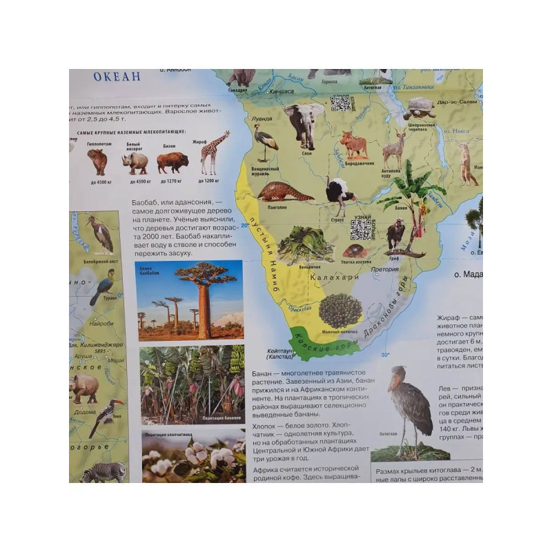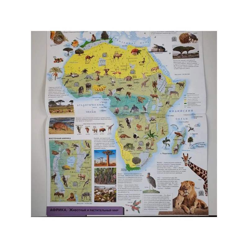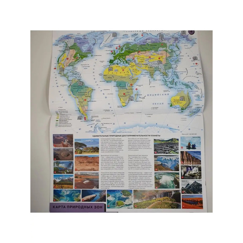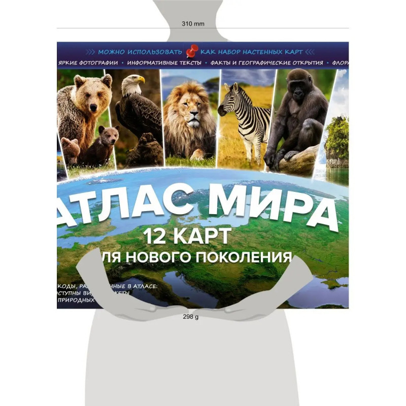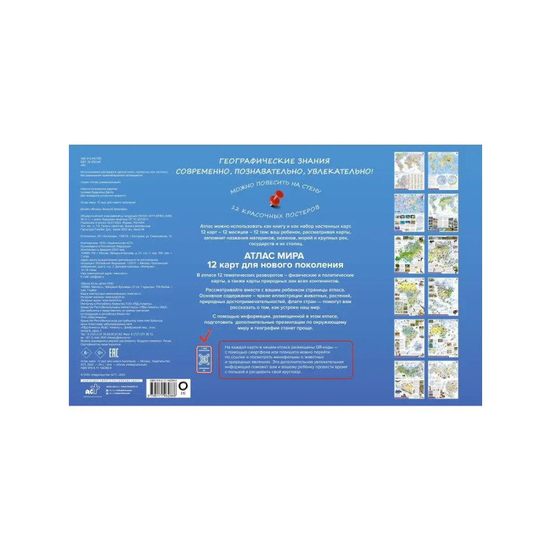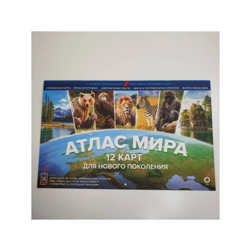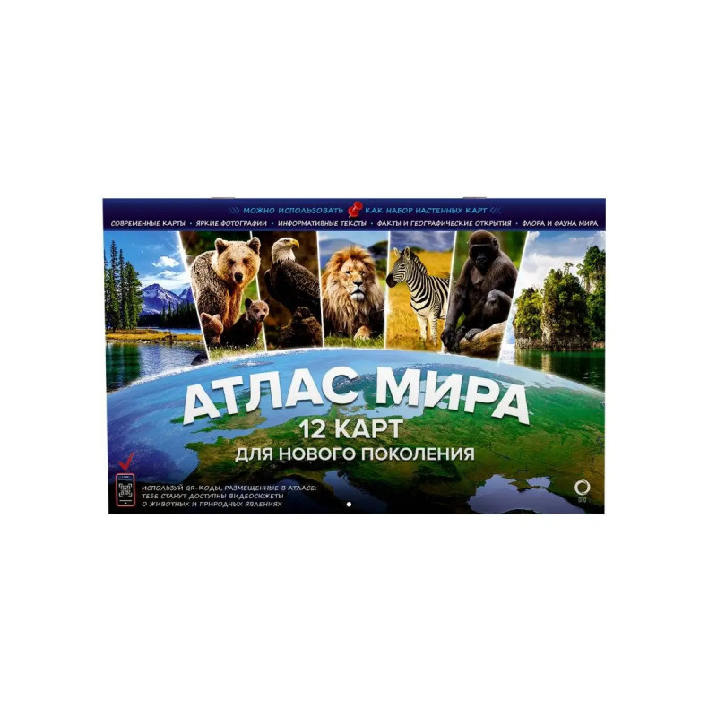 В атласе 12 тематических разворотов физические и политические карты, а также карты природных зон всех континентов. Карты подготовлены редакцией ОГИЗ, выпускающей картографическую продукцию для детей и взрослых. Рассматривайте вместе с вашим ребенком страницы атласа. Основное содержание яркие иллюстрации животных, растений, природных достопримечательностей, флаги стран помогут вам рассказать о том, как устроен наш мир. Придумывайте и совершайте виртуальные путешествия по планете Земля! В нашем атласе размещены QR-коды. С помощью смартфона или планшета можно перейти по ссылке и посмотреть минифильмы о животных и природных явлениях. Дополнительная увлекательная информация в книге поможет вашему ребенку провести время с пользой, расширить кругозор. Атлас можно повесить на стену в виде красочного изменяемого постера размером 47,5х6 см. 12 карт 12 месяцев 12 тем. Ваш ребенок, разглядывая карты, запомнит названия материков, океанов, морей и крупных рек, государств и их столиц. С помощью информации, разме