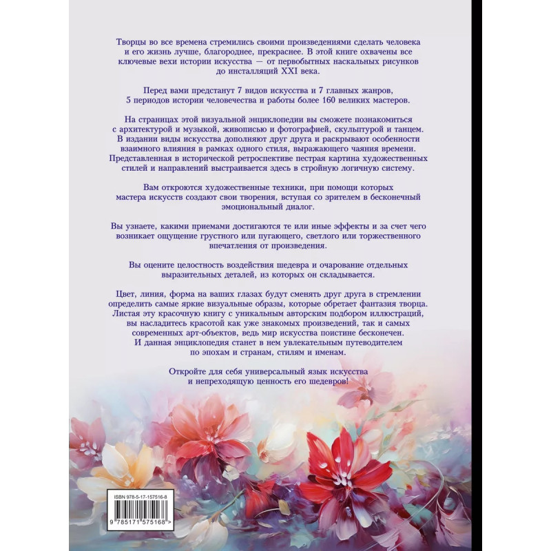 Искусство. Большая визуальная энциклопедия. В этом издании представлена история становления и развития мирового искусства от эпохи палеолита и до настоящего времени. Вы сможете познакомиться с архитектурой и музыкой, живописью и фотографией, скульптурой и танцем. В этой визуальной энциклопедии виды искусства дополняют друг друга и раскрывают особенности взаимного влияния в рамках одного стиля, выражающего чаяния времени. Представленная в исторической ретроспективе пестрая картина художественных стилей и направлений во всем многообразии их сходств и различий выстраивается здесь в стройную логичную систему. Листая красочные страницы с эксклюзивным авторским подбором иллюстраций, вы сможете насладиться красотой творений выдающихся мастеров разных эпох и стран, стилей и жанров, а интересная информация и неожиданные факты расширят ваши знания и подарят новый взгляд как на уже знакомые шедевры, так и на самые современные. Откройте для себя бесконечный мир искусства и непреходящую ценность его произведений в этом уникальном издании!