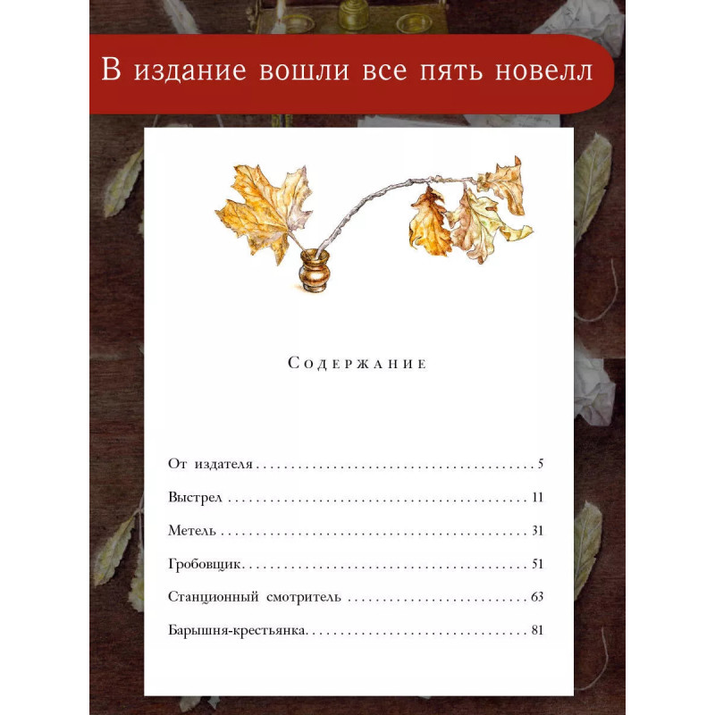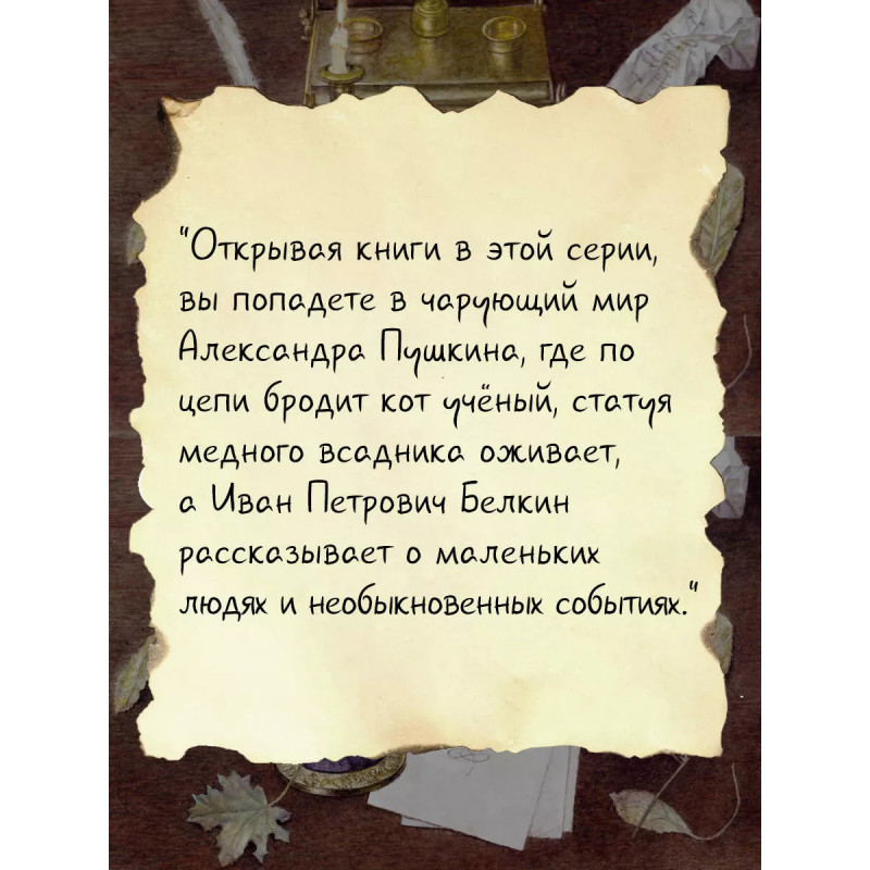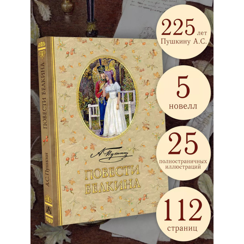 В 1830 году Александр Сергеевич Пушкин удачно сватается к Наталье Гончаровой. Затем отправляется в своё имение Большое Болдино, чтобы уладить кое-какие дела перед свадьбой. Неожиданная вспышка холеры в Москве задерживает возвращение счастливого жениха. А.С. Пушкин остается в Болдино и пишет, по словам самого поэта, как давно уже не писал. Именно здесь из-под его пера выходят Повести Белкина - первое законченное произведение в прозе, которое было напечатано под псевдонимом А.П.. Каждая из пяти историй рассказывает о судьбе меленького человека, будь то станционный смотритель или гробовщик. А также о том, как счастливая или даже нелепая случайность может изменить всю его жизнь. Иллюстрации для книги нарисовал профессор ВГИК, Заслуженный художник России Александр Дудин. Издание подготовлено к 225-летию со дня рождения А. С. Пушкина.