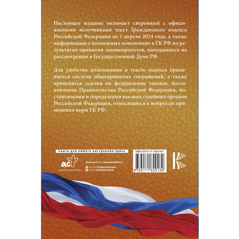 Гражданский кодекс Российской Федерации на 1 апреля 2024 года. Со всеми изменениями, законопроектами. Данное издание Гражданского кодекса Российской Федерации сверено с официальным источником и приводится по состоянию на 1 апреля 2024 года. Кодекс учитывает все изменения, опубликованные в официальных источниках на момент подписания издания в печать. В издании представлена информация о возможных изменениях в ГК РФ по результатам принятия законопроектов, находящихся на рассмотрении в Государственной Думе РФ. Для более удобного использования в тексте кодекса применяется система сокращенного написания отдельных слов и выражений, а также приводятся ссылки на федеральные законы, постановления и определения высших судебных органов Российской Федерации, относящиеся к вопросам применения норм гражданского права.