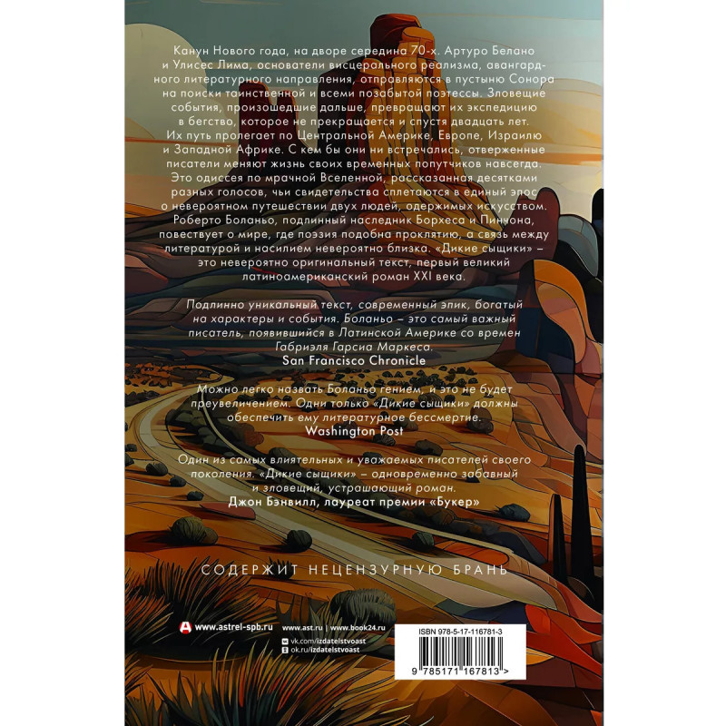 Дикие сыщики. Канун Нового года, на дворе середина 70-х. Артуро Белано и Улисес Лима, основатели висцерального реализма, авангардного литературного направления, отправляются в пустыню Сонора на поиски таинственной и всеми по- забытой поэтессы. Зловещие события, произошедшие дальше, превращают их экспедицию в бегство, которое не прекращается и спустя двадцать лет. Их путь пролегает по Центральной Америке, Европе, Израилю и Западной Африке. С кем бы они ни встречались, отверженные писатели меняют жизнь своих временных попутчиков навсегда. Это одиссея по мрачной Вселенной, рассказанная десятками разных голосов, чьи свидетельства сплетаются в единый эпос о невероятном путешествии двух людей, одержимых искусством. Роберто Боланьо, подлинный наследник Борхеса и Пинчона, повествует о мире, где поэзия подобнО проклятию, а связь между литературой и насилием невероятно близка. "Дикие сыщики" - это невероятно оригинальный текст, первый великий латиноамериканский роман XXI века.