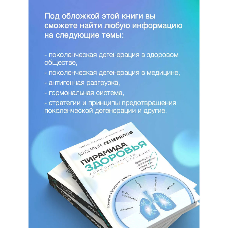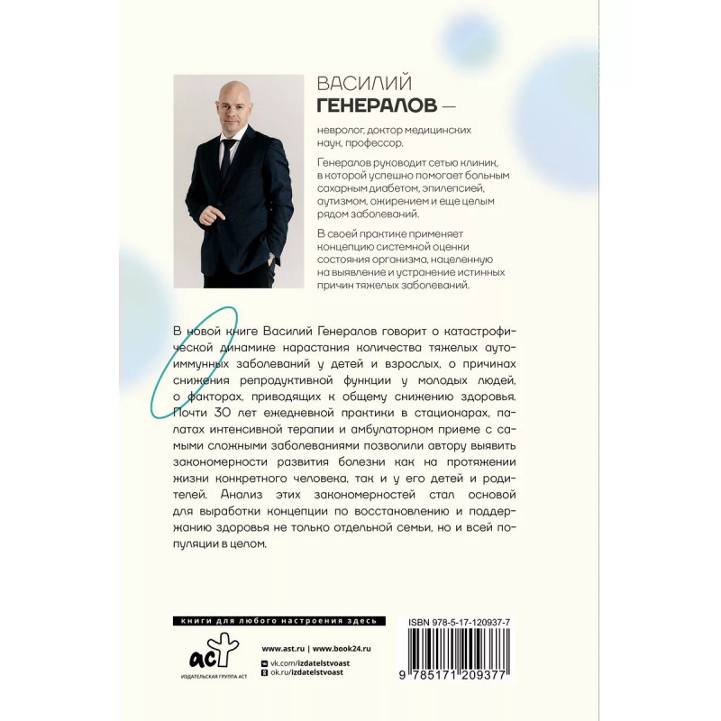 В новой книге Василий Генералов говорит о катастрофической динамике нарастания количества тяжелых аутоиммунных заболеваний у детей и взрослых, о причинах снижения репродуктивной функции у молодых людей, о факторах, приводящих к общему снижению здоровья. Почти 30 лет ежедневной практики в стационарах, палатах интенсивной терапии и амбулаторном приеме с самыми сложными заболеваниями позволили автору выявить закономерности развития болезни как на протяжении жизни конкретного человека, так и у его детей и родителей. Анализ этих закономерностей стал основой для выработки концепции по восстановлению и поддержанию здоровья не только отдельной семьи, но и всей популяции в целом.