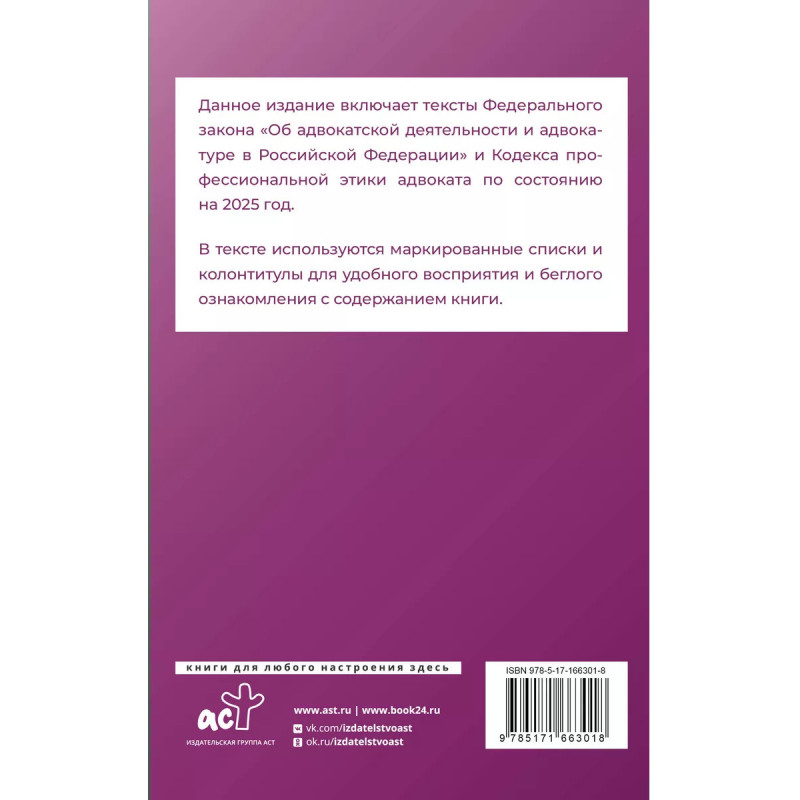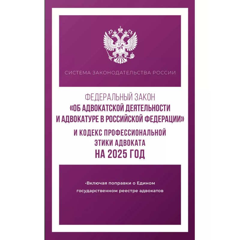 Данное издание включает тексты Федерального закона "Об адвокатской деятельности и адвокатуре в Российской Федерации" и Кодекса профессиональной этики адвоката на 2025 год. В тексте используются маркированные списки и колонтитулы для удобного восприятия и беглого ознакомления с содержанием книги. Издание учитывает все изменения, опубликованные в официальных источниках на момент подписания издания в печать.