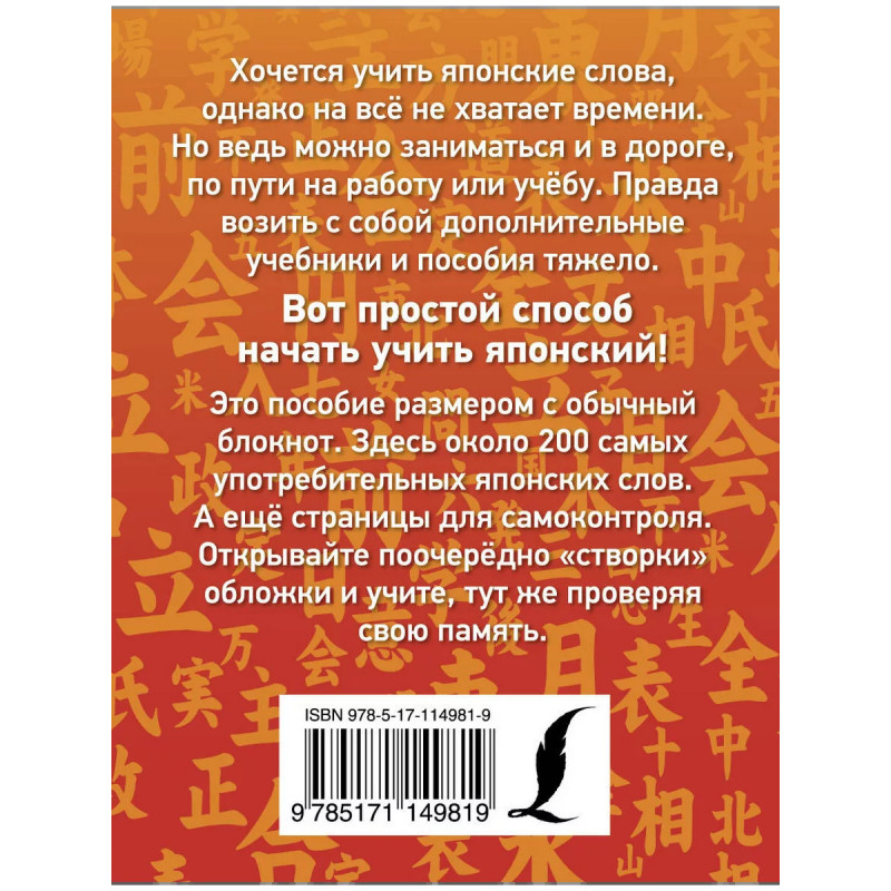 Учим японские слова. В серию "Запоминаем легко и просто" входят пособия-блокноты по европейским и восточным языкам. Особый дизайн (обложка с клапанами, закрывающими текст) дает возможность эффективно заучивать иностранные слова и проверять себя. Удобный формат позволяет всегда иметь пособие при себе и не прерывать занятия. Пособие-блокнот "Учим японские слова" предлагает для заучивания около 200 самых употребительных японских слов. Слова организованы по темам. Даны иероглифическое написание, чтение азбукой и произношение русскими буквами. Издание предназначено для всех, кто интересуется японским языком.
