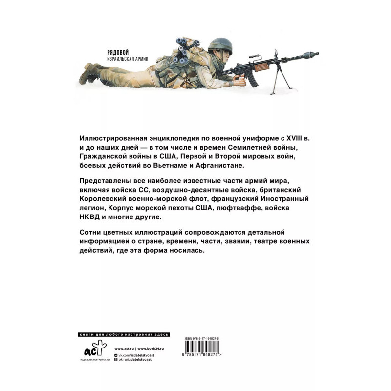 Иллюстрированный справочник по военной униформе за период с XVIII в. и до наших дней в т.ч. времен Семилетней войны, Гражданской войны в США, Первой и Второй мировых войн, боевых действий во Вьетнаме и Афганистане. Здесь представлены все наиболее известные части армий мира, включая войска СС, воздушно-десантные войска, британский Королевский военно-морской флот, французский Иностранный легион, Корпус морской пехоты США, люфтваффе, войска НКВД и многие другие. Книга адресована широкому кругу читателей, интересующихся военной историей и историей военного костюма.