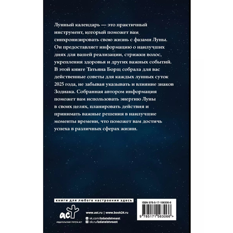Лунный календарь это практичный инструмент, который поможет вам синхронизировать свою жизнь с фазами Луны. Он предоставляет информацию о наилучших днях для вашей реализации, стрижки волос, укрепления здоровья и других важных событий. В этой книге Татьяна Борщ собрала для вас действенные советы для каждых лунных суток 2025 года, не забывая указывать и влияние знаков Зодиака. Собранная автором информация поможет вам использовать энергию Луны в своих целях, планировать действия и принимать важные решения в наилучшие моменты времени, что поможет вам достичь успеха в различных сферах жизни.