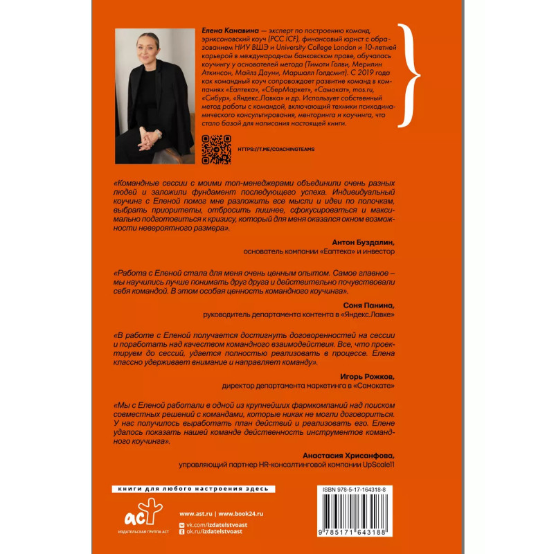 Елена Канавина эксперт по построению команд, эриксоновский коуч (PCC ICF), финансовый юрист с образованием НИУ ВШЭ и University College London и 10-летней карьерой в международном банковском праве, обучалась коучингу у основателей метода (Тимоти Голви, Мерилин Аткинсон, Майлз Дауни, Маршалл Голдсмит). С 2019 года как командный коуч сопровождает развитие команд в компаниях "Еаптека", "СберМаркет", "Самокат", mos ru, "Сибур", "Яндекс.Лавка" и др. Использует собственный метод работы с командой, включающий техники психодинамического консультирования, менторинга и коучинга, что стало базой для написания настоящей книги.